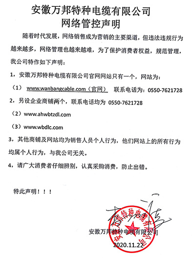 鄭重聲明:安徽萬邦特種電纜有限公司官方網站為:www.wanbangcable_com.1hr2f.cn,除此之外無任何子網站或合作網站,其余均為假冒偽劣。電話:0550-7621728 13485756353 地 址:安徽省天長市滁州高新技術產業開發區經四路29號
